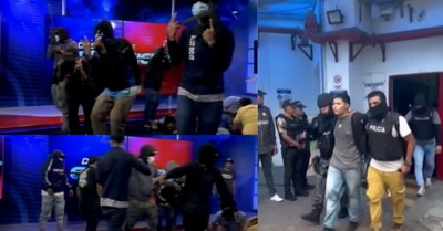 A group of masked men with guns and explosives broke into a TV studio in Guayaquil, Ecuador, during a live broadcast on Tuesday.