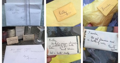 There was one note wrapped around money and addressed to Kathy. It read, "Kathy, go get a pizza, shrimp, or something you both like. Aunt Alison. Get a ‘bath’ ready.”